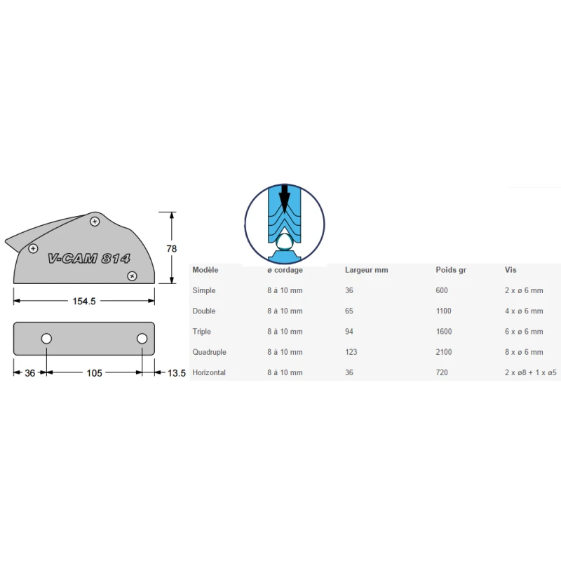 ANTAL Bloqueur V-CAM 814 ø 8-10 est l’équipement idéal pour votre voilier pour drisses de 8 à 10 mm de diamètre, accastillage haute qualité!