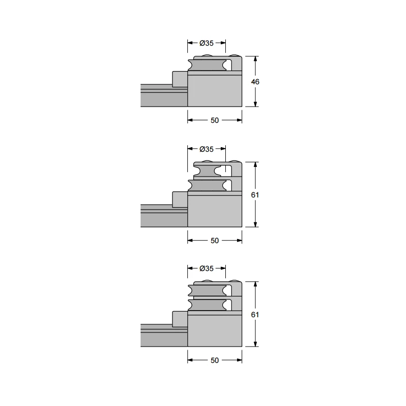 Décliné en 4 versions, avec réas de ø 35 mm, ces embouts de génois pour rail d’écoute Antal 4 Race taille 100 sont tous équipés d’un patin caoutchouc afin d’amortir les retours violents du chariot. Ces 4 embouts vous permettront de créer facilement un palan de renvoi ou de réglage en 1:1, 2:1 et 3:1. Une version renforcée est aussi disponible pour les chariots nécessitant une force puissance de rappel.