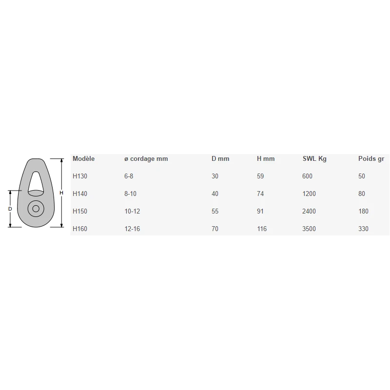 | Modèle | ø cordage mm | D mm | H mm | CMU Kg | Poids gr |