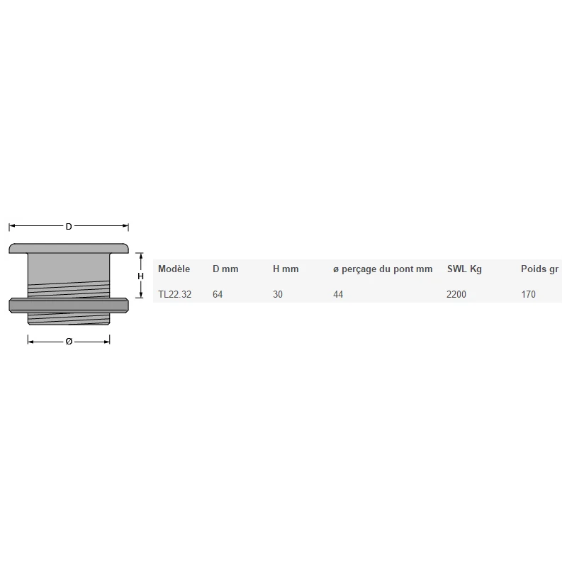 | Modèle | D mm | H mm | ø perçage du pont mm | SWL Kg | Poids gr |
