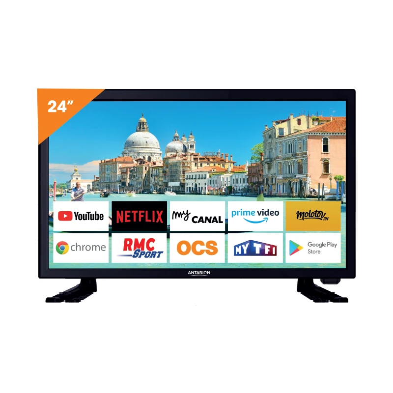 Téléviseur 12V de la marque ANTARION avec un panel d’applications connectées, la Smart TV est proposée avec un écran de 24 pouces pour un confort optimal lors du visionnage de vos films et séries préférées à bord de votre camping-car et fourgon aménagé.