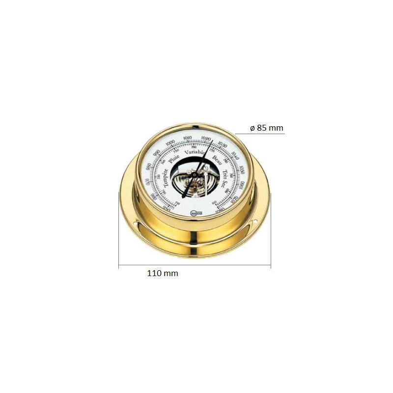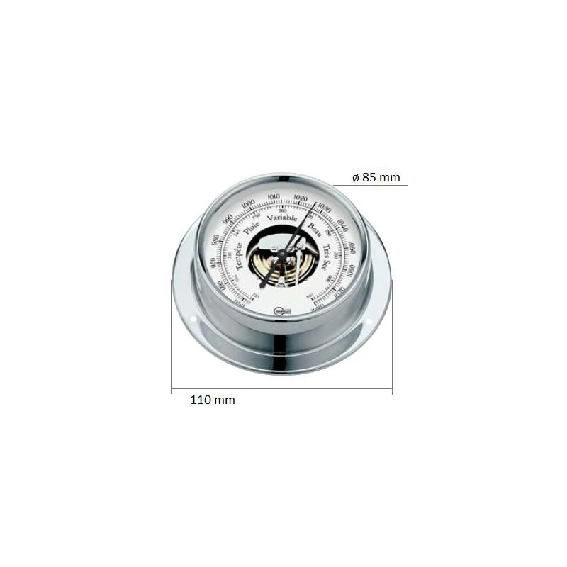Baromètre à aiguille couleur laiton ou chromée, grand classique dela marque BARIGO avec sont cadran en verre de 85 mmde diamètre.