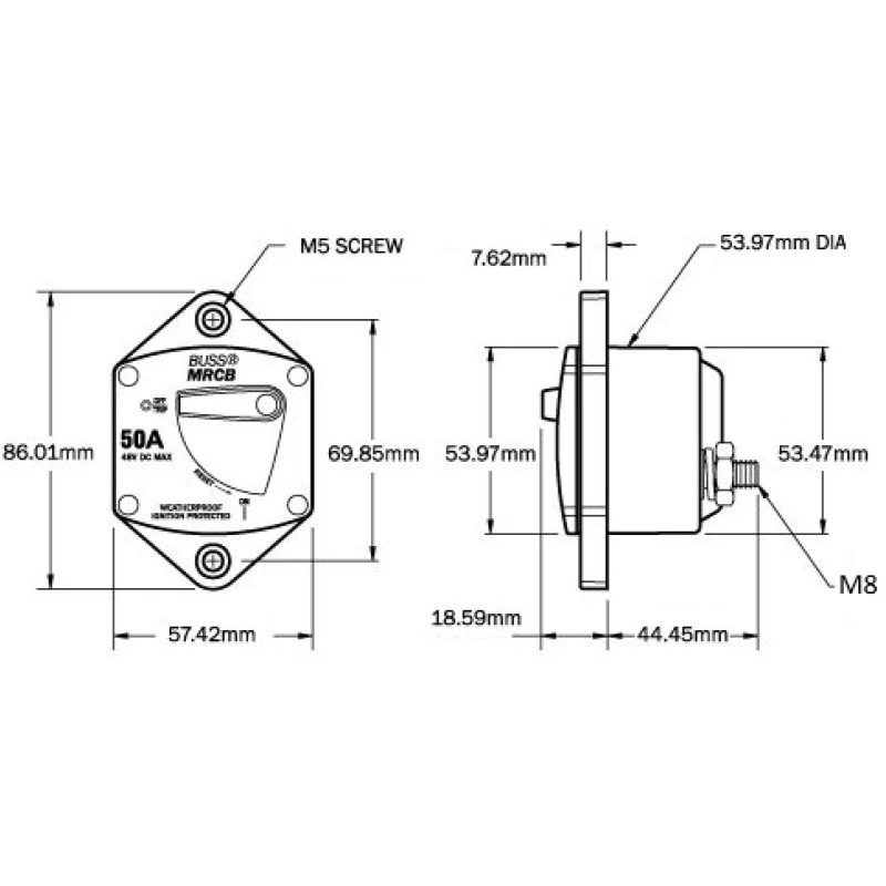Caractéristiques du disjoncteur thermique BLUE SEA Série 187 – 50 A :