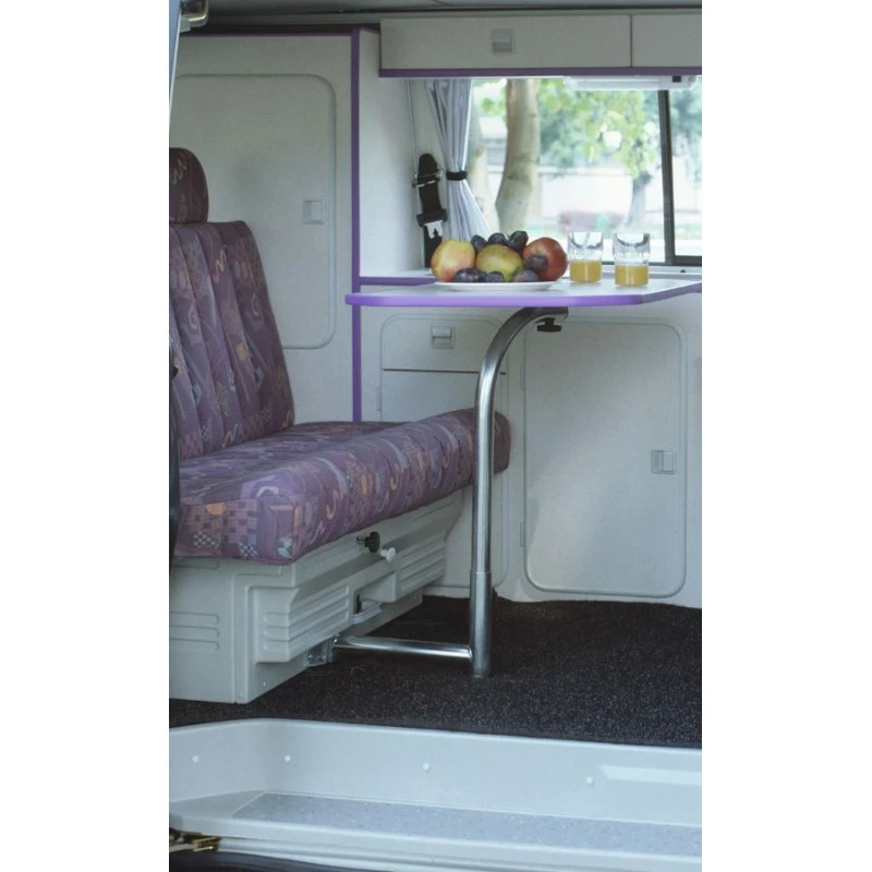 Accessoire camping-car de qualité, il est fabriqué en acier galvanisé robuste. Il est bien entendu livré avec son support de fixation sur la paroi. En standard, la hauteur du pied de table est de 72 cm mais il peut bien entendu être découpé afin que le plateau soit plus bas. Le déport est quant à lui de 40 cm.