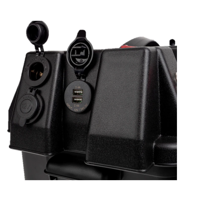 Pour l’utilisation, c’est très simple ! Il suffit de connecter les bornes + & – de votre batterie au câblage présent a l’intérieur de la box. Vous pourrez ensuite utilisez directement les sorties 12 V & USB présentes sur le boitier, pour charger vos téléphoner ou alimenter une glacière électrique par exemple.