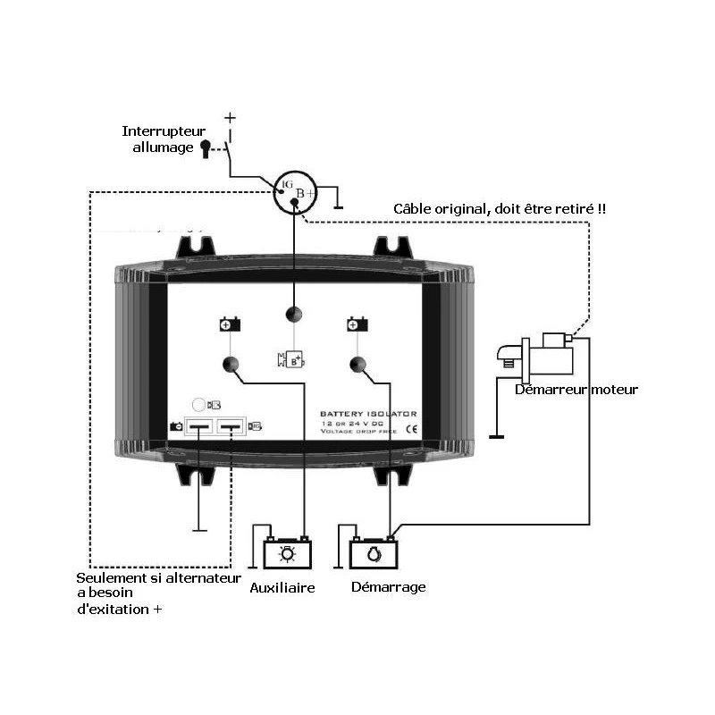 – Connexions : + batteries sur tiges filetées (écrous fournis) ; – batteries sur cosse Faaston au moins commun
