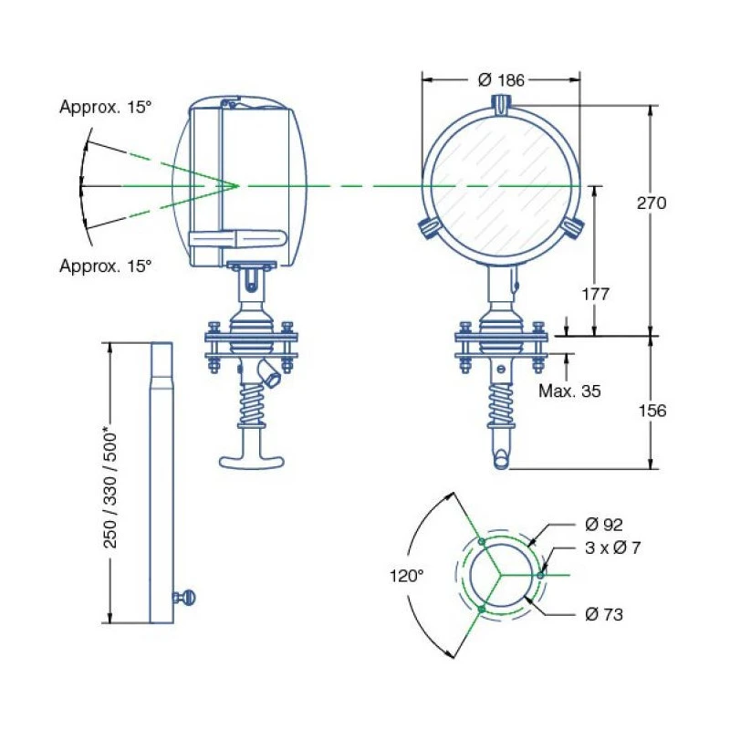 Ce modèle de projecteur de route bateau est donc orientable à l’aide d’une rotule et d’une poignée traversante installée dans la timonerie du bateau. Alimenté en 12 V, il offre une puissance de 100 W pour une éclairage de 225 000 cd.