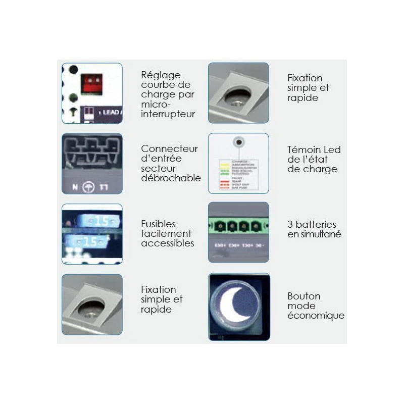Avec sa protection contre les surcharges et son système d’installation facile et fiable le chargeur peut être connecté en permanence aux batteries sans aucun risque.