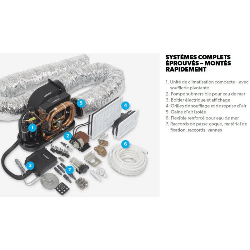 Le kit est livré avec une pompe à eau de mer assurant un échange de calories du groupe super efficace, la climatisation est bien entendu réversible en mode pompe à chaleur pour fonction chauffage utilisable en hiver jusqu’à une température d’eau de 6°C !