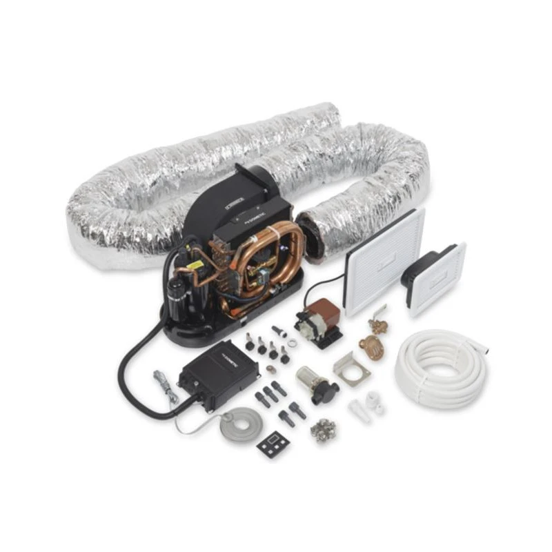 Le kit est livré avec une pompe à eau de mer assurant un échange de calories du groupe super efficace, la climatisation est bien entendu réversible en mode pompe à chaleur pour fonction chauffage utilisable en hiver jusqu’à une température d’eau de 6°C !
