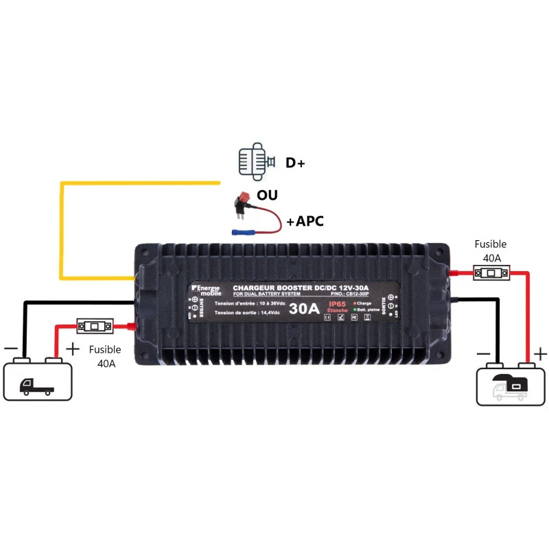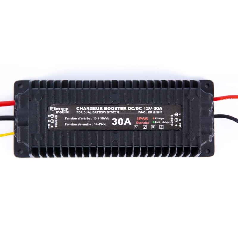 Il n’y a pas plus simple que le puissant chargeur booster 30A DC/DC en 12V ENERGIE MOBILE CB12-30 IP, ce chargeur Booster est conçu pour se connecter sur tous type de batterie (plomb, acide, décharge lente, Lithium LiFePO4) il assure un courant de charge continu de 30A des lors que le moteur du bateau ou du véhicule s’allume.