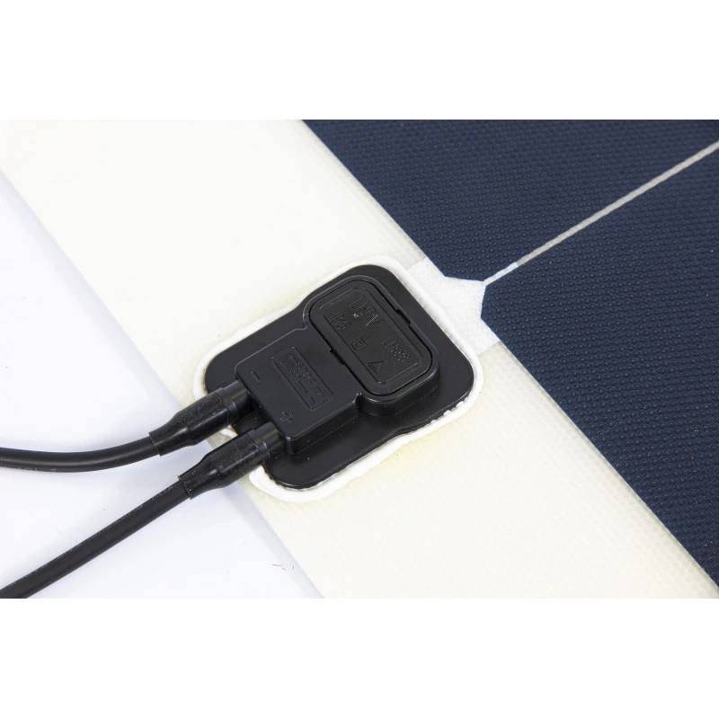 Le panneau solaires Marine Flex est précablé avec 150 cm de câble, avec terminaison MC4. Idéal pour un système Plug & Play, & réaliser des connexion en série/parallèles. Le boitier de jonction est particulièrement compact & résistant aux impacts. Il est possible d’installer ce panneau dans une zone de passage, pour un piétinement occasionnel (ex : pont de bateau)