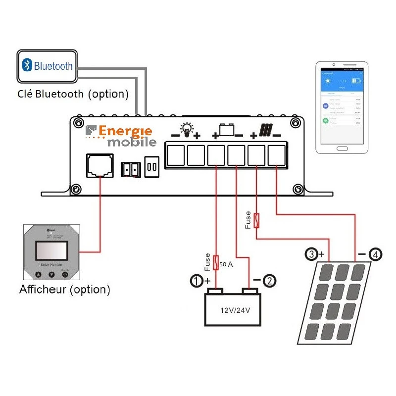 Caractéristiques technique du régulateur de charge solaire ENERGIE MOBILE MPPT Bluetooth 40A :