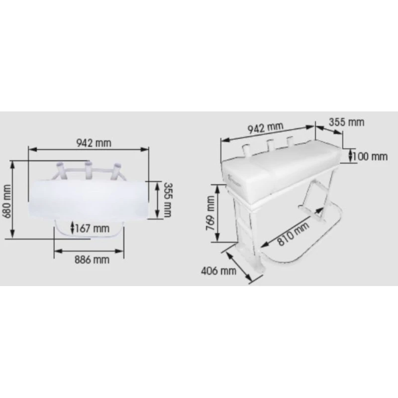 - Encombrement à la base : 942 x 406 mm
