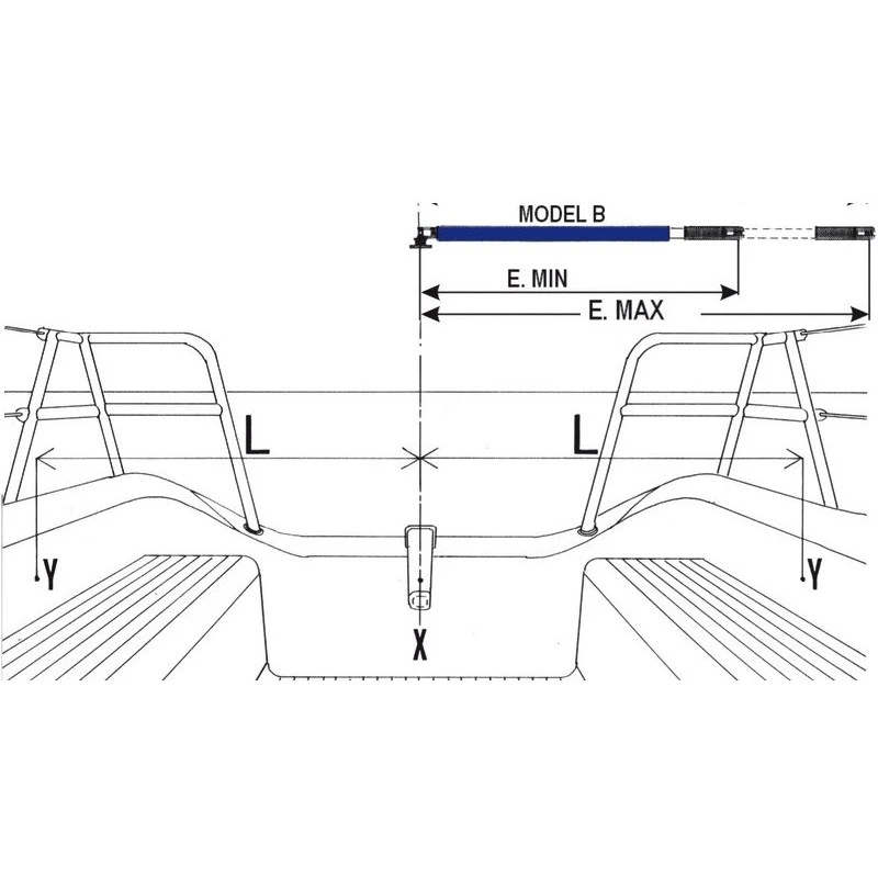 Pour le choix du modèle (585 – 821 mm ; 642 – 935 mm ou 750 – 1043 mm), se rapporter à la mesure L du schéma. L = distance entre Y et X ou Y est le crochet de fixation et X la barre au centre du bateau :
