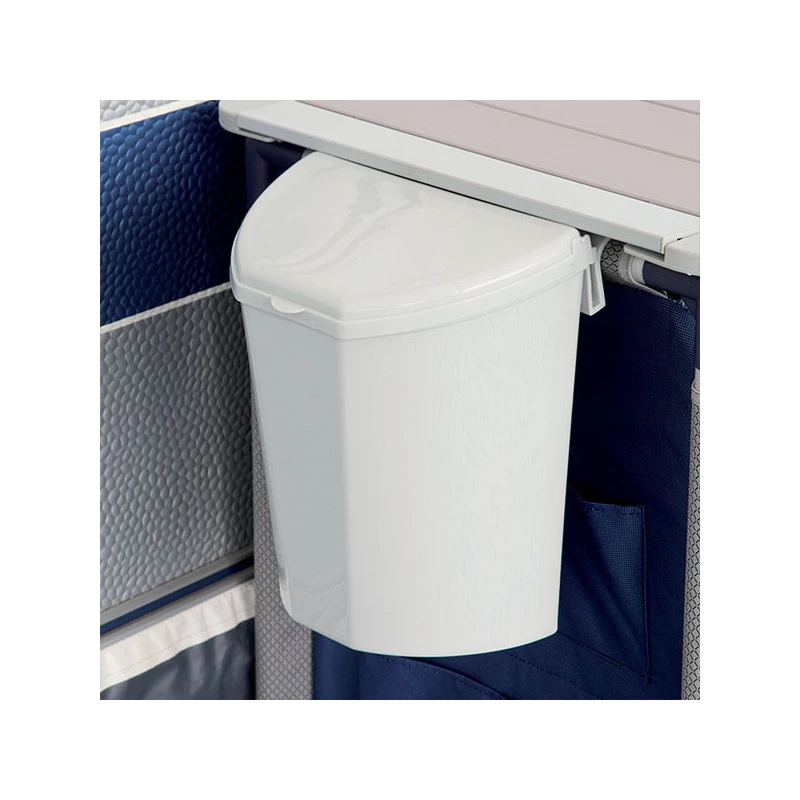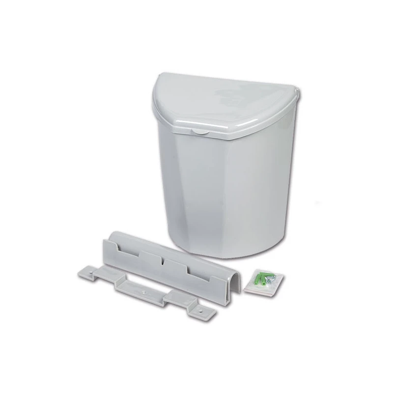 Poubelle compacte avec couvercle et supports de fixation, idéal pour le camping-car ou la caravane.
