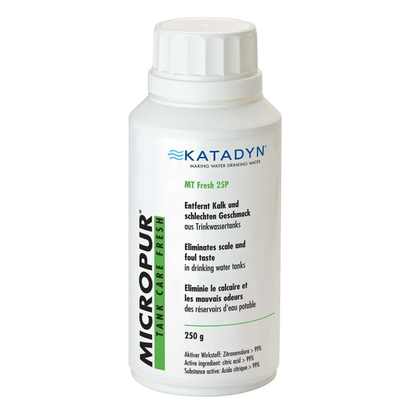 Additif KATADYN, le Micropur Tank Care Fresh 25P est conçu pour éliminer le calcaire ainsi que les mauvaises odeurs présents à l’intérieur des réservoirs d’eau camping-car & bateau.