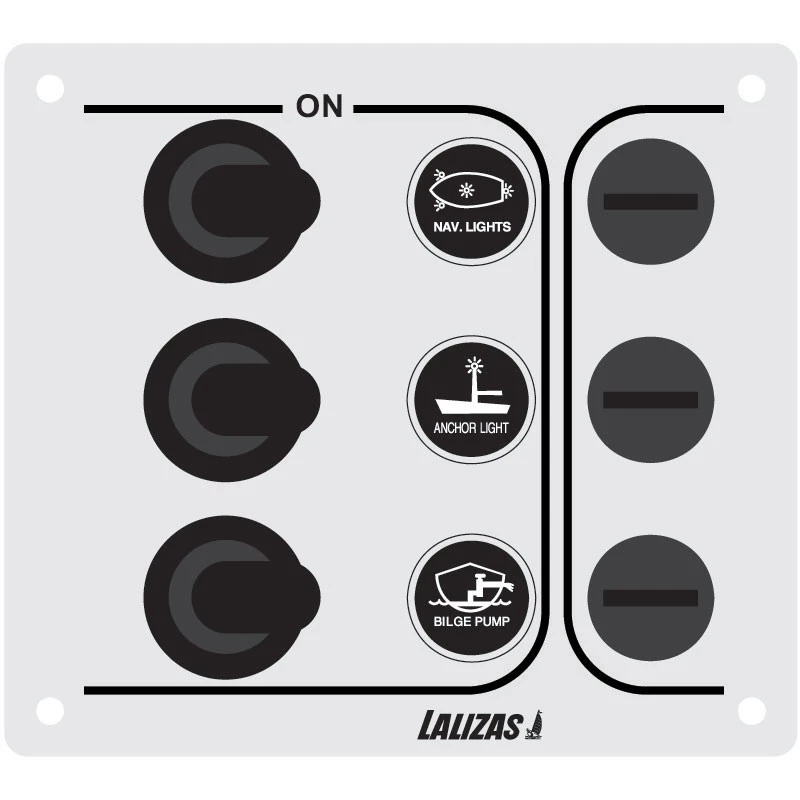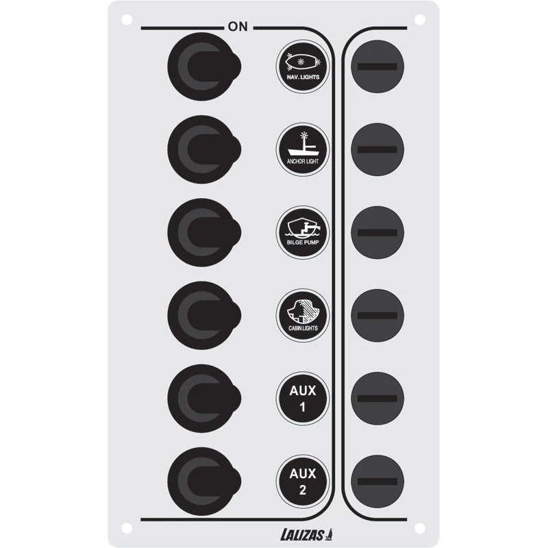 Ce tableau électrique du fabriquant LALIZAS possède des interrupteurs à levier & fusible verre pour contrôler le circuit électrique du bateau & du camping-car.