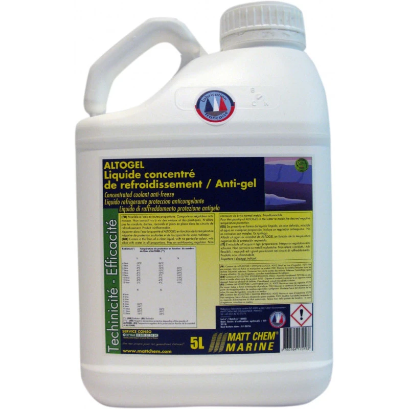 Le MATT CHEM Alotogel est un liquide de refroidissement antigel pour moteur de bateau assurant une parfaite protection anti-gel. Miscible à l’eau en toutes proportions. Comporte un régulateur anti-mousse. Non corrosif vis à vis des métaux et des plastiques. N’altère pas les conduits, durites, raccords et joints en place dans les circuits de refroidissement.