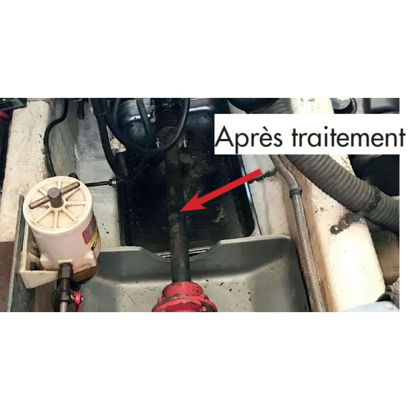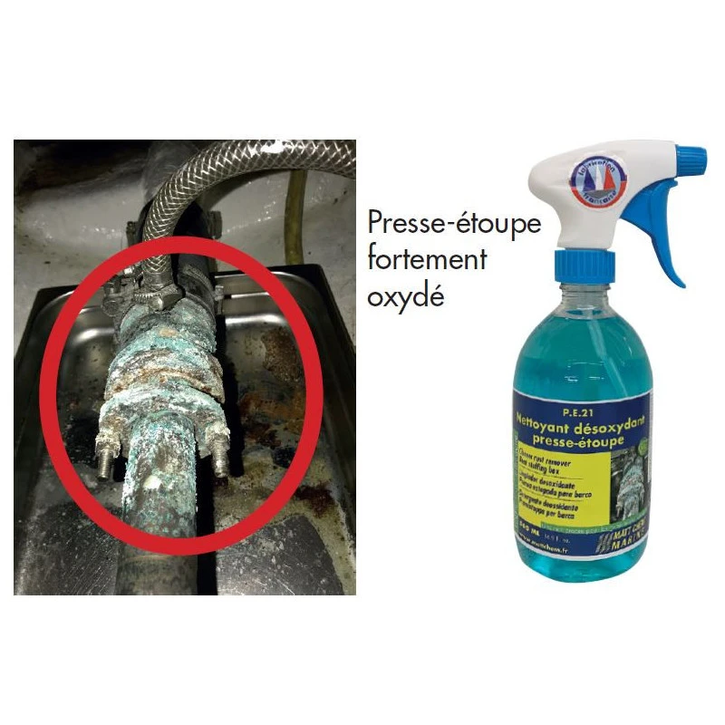 Le P.E.21 permet donc de remettre à neuf la sortie du presse-étoupe de votre bateau. Il agit en trois phases : dégraissante en éliminant les dépôts de sel ; désoxydante en dégradant la rouille et l’oxydation sur le métal ; enfin il offre une action passivante par phosphatation qui protégera votre presse-étoupe. Comme tous les produits d’entretien de la marque, il est très facile à appliquer. Il suffit en effet de pulvériser et de laisser agit, pas de rinçage !