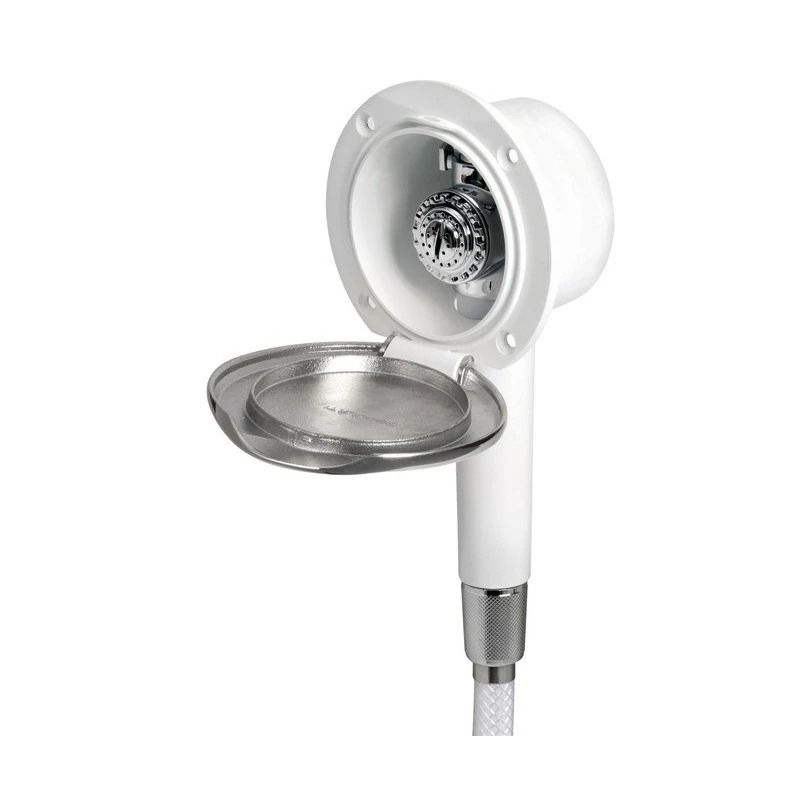 Coffret douchette très résistant avec couvercle en inox et flexible pour pont du bateau ou aménagement du fourgon aménagé, installation vertical.