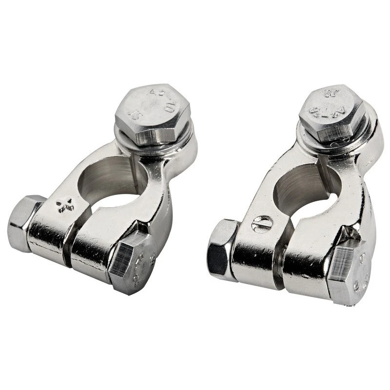 Paire de cosse à batterie polarisée + et – OSCULATI en laiton nickelé capables de résister à un fort ampérage, conçu pour les batteries auxiliaires ou de démarrage en bateau, camping-car, fourgon et van aménagé. Connexion pour câble via bornier ø M8.