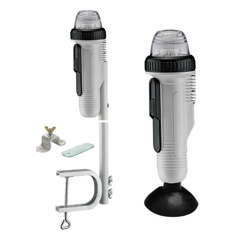 Feu de navigation à Led pour bateau tout horizon. Equipement fonctionnement sur pile éclairage blanc à 360°. deux modèles aux choix : fixation ventouse ou avec clip pour tube.