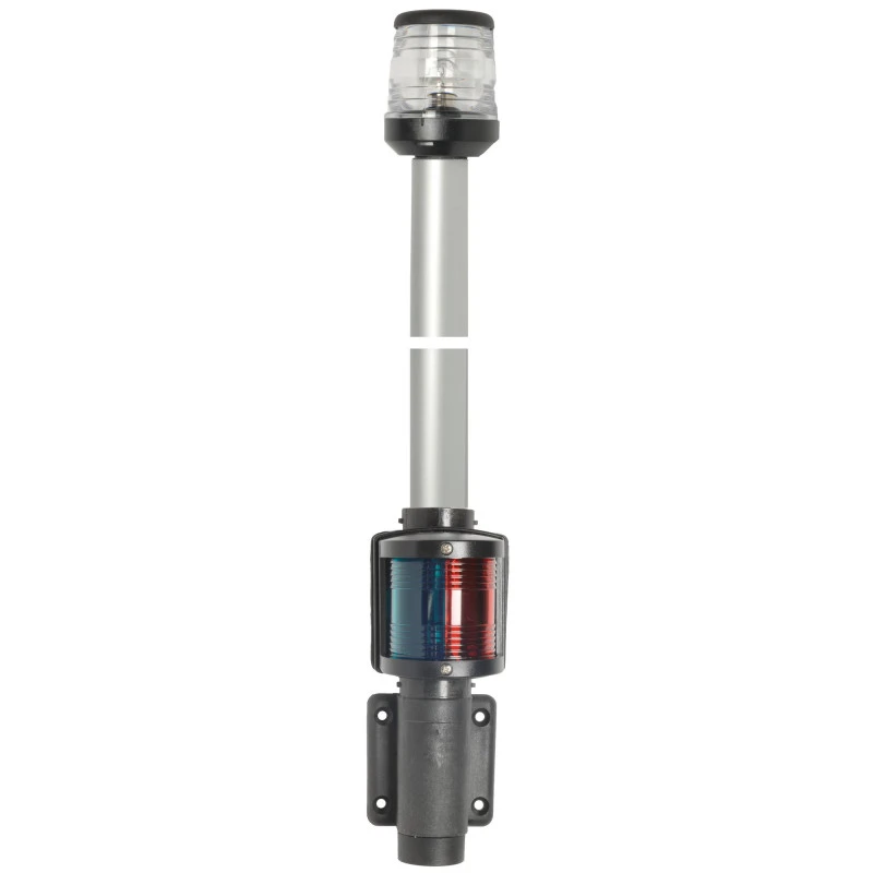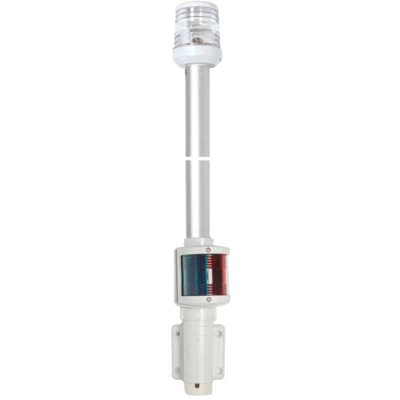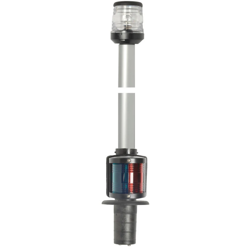 Equipement pour bateau de qualité, le feu se compose d’un feu blanc 360° et d’un feu rouge/vert sur une hampe de 100 cm.