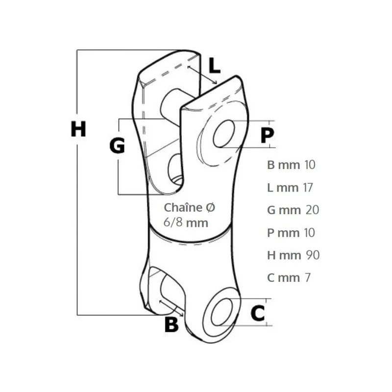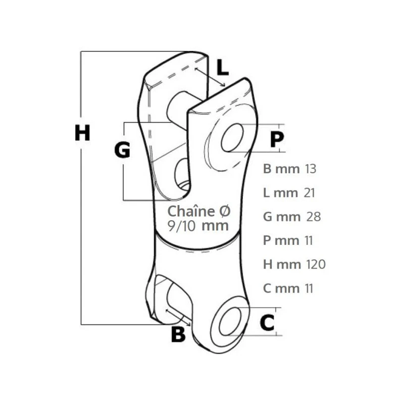Caractéristiques de la manille double axe + émerillon pour jonction ancre chaîne :