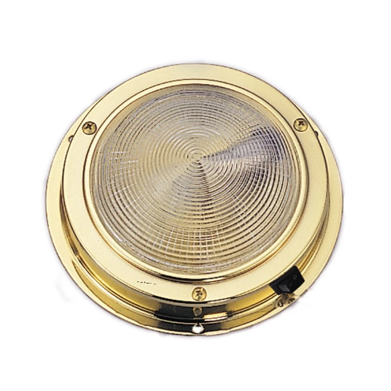 Plafonnier 12 V type « Japonais » en laiton poli (doré) type marine avec interrupteur à levier intégré conçu pour l’éclairage intérieur du bateau, camping-car, van ou fourgon aménagé. Design OSCULATI classique avec verrine en polycarbonate résistant.