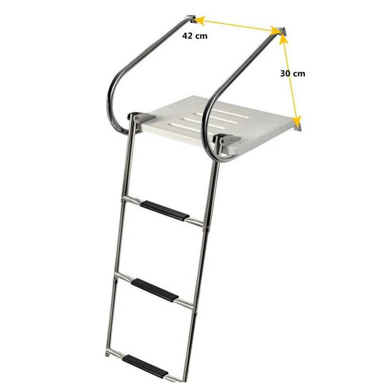 Accessoire de qualité, la plateforme polyamide renforcé fibre ne nécessite aucun entretien. La structure en inox 316 qualité marine se fixe facilement sur tout type de tableau arrière de vedette, bateau moteur ou voilier et offre un parfait acces à l’eau pour la baignade comme pour la plongée. Cette plateforme antidérapante peut être équipée d’une échelle telescopique 3 marches repliable sur le caillebotis en navigation!