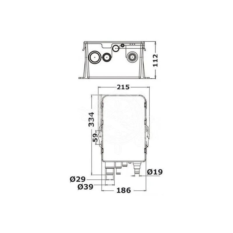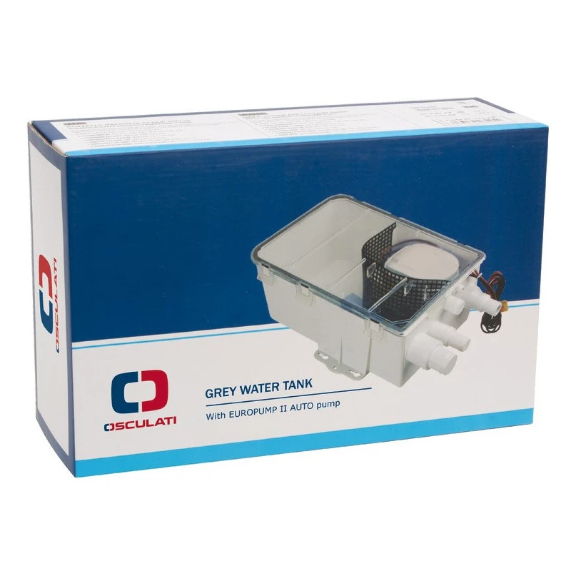 Collecteur d’eaux usées OSCULATI complet avec bac récupérateur des eaux usées (douches et lavabos) avec pompe automatique 12 ou 24 V, pour l’équipement de la salle de bain des bateaux ou camions aménagés.