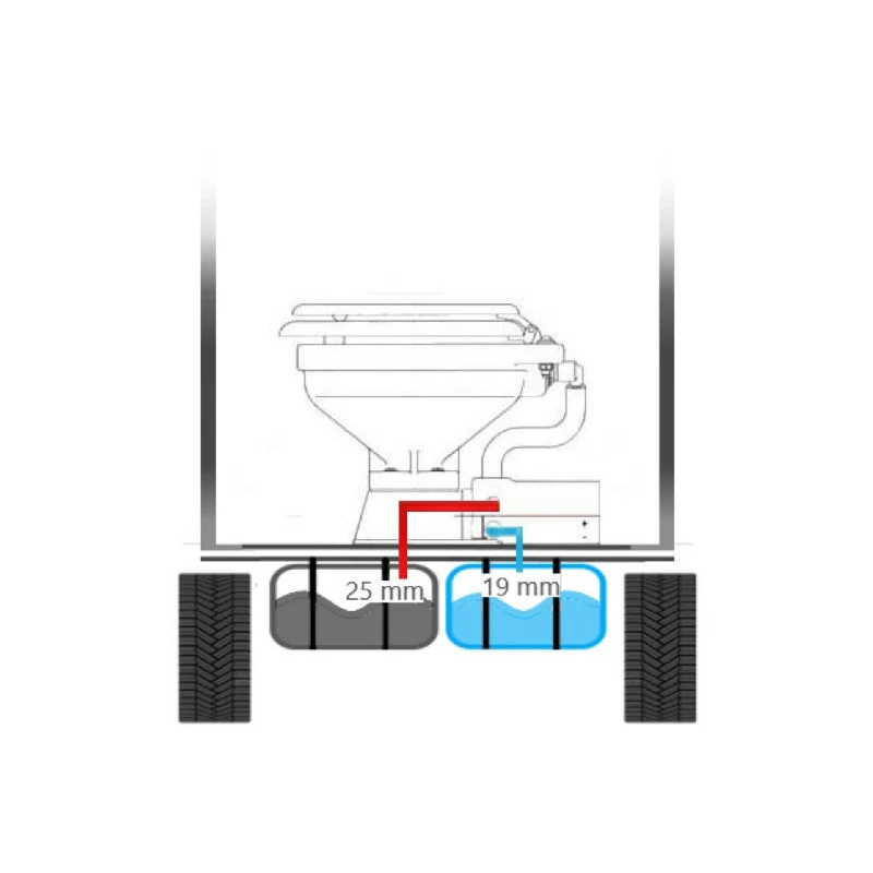 Simple à raccorder, prévoyez du tuyau en diamètre 20 mm pour l’alimentation en eau propre ou eau de mer et du tuyau de diamètre 25 mm pour l’évacuation.
