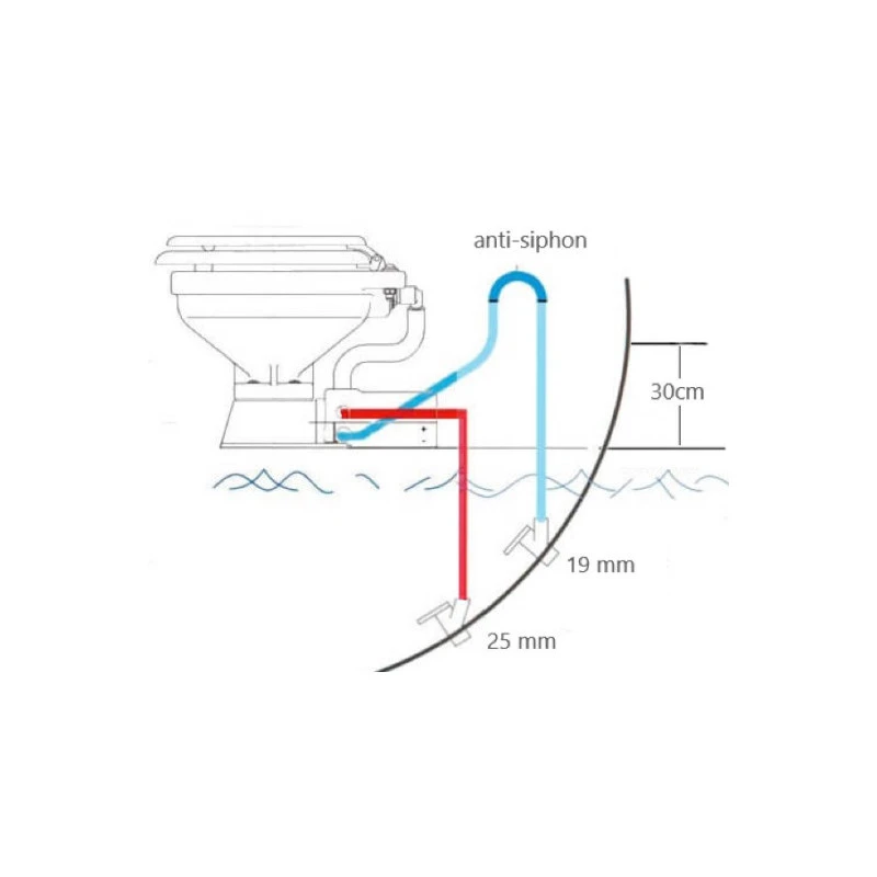 Sur bateau, l’utilisation d’un coude antisiphon est obligatoire pour la prise d’eau. Sur véhicule, un coude anti-siphon sera, lui aussi, indispensable si le réservoir est situé plus haut que le WC (idem pour montage sur réservoir en bateau)