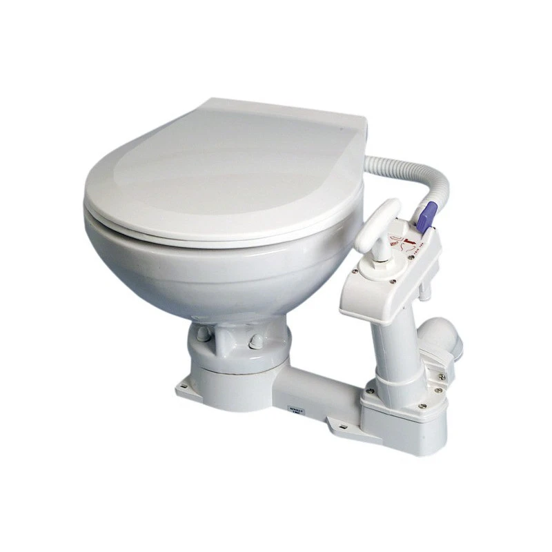 WC manuel pour bateau avec grande cuvette en porcelaine et abattant en bois pour un confort optimisé, pompe de vidange manuelle. Modèle OSCULATI avec emprise au sol universel (idem JABSCO, RM69…)