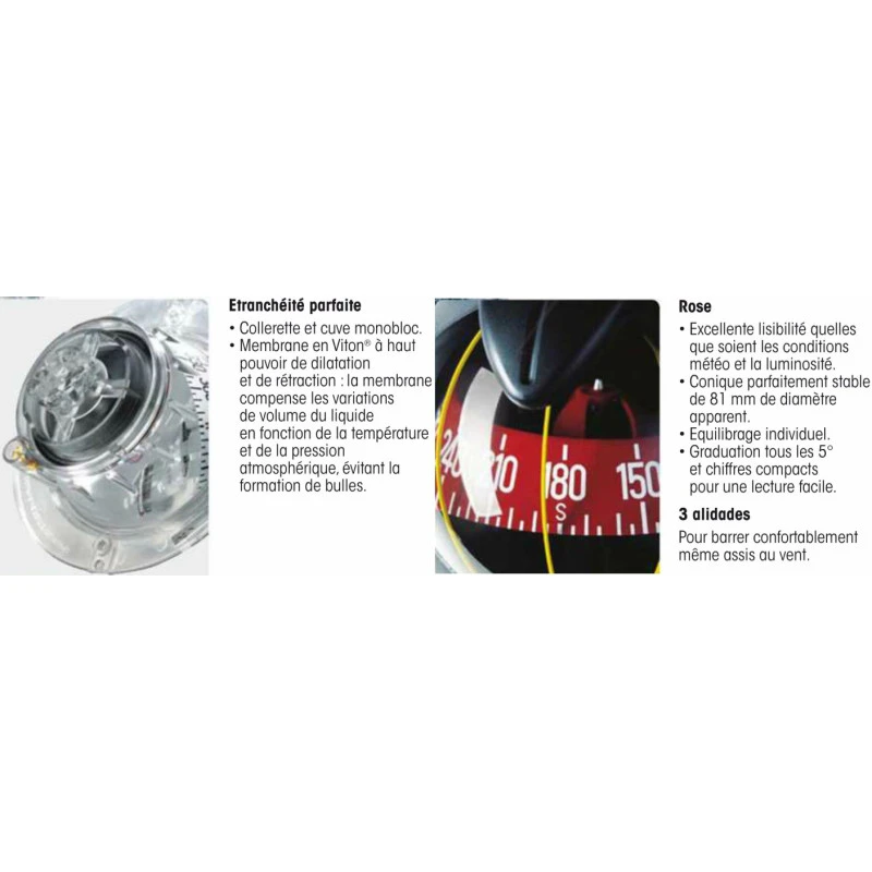Avec ces trois alidades et sa nouvelle rose conique ø apparent de 81 le compas reste lisible quelle que soit votre angle de vision. Livré en standard avec un éclairage 12 V, le compas est également doté d’un clinomètre gradué tous les 10°.