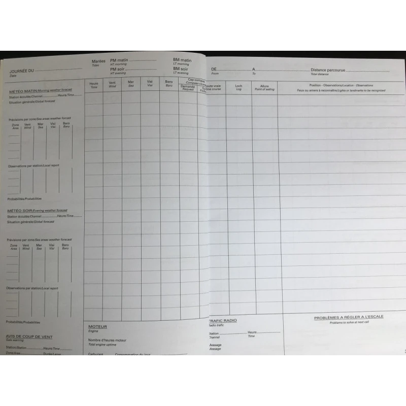 Equipement pour bateau obligatoire à bord, le journal de bord retrace toutes vos sorties, heures de départ, équipage, météo… 104 pages sont disponibles dans ce livre de bord proprement relié avec sa couverture rigide pelliculée. Pour noter à chacune de vos sorties tous les éléments essentiels de vos navigations.