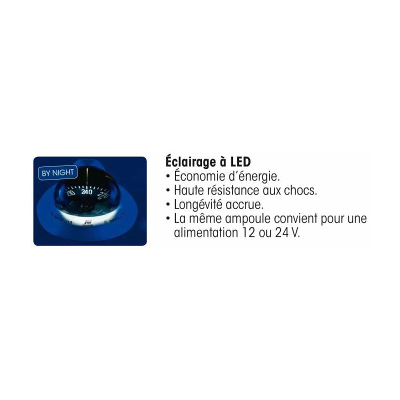 Accessoire marin de qualité, le compas est livré en standard avec un éclairage LED et est garantie 5 années.