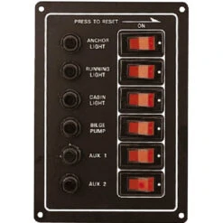 Tableau électrique vertical aluminium anodisé noir PLASTIMO équipé de 6 interrupteurs. Equipement pour bateau, camping car et fourgon.