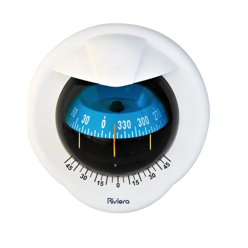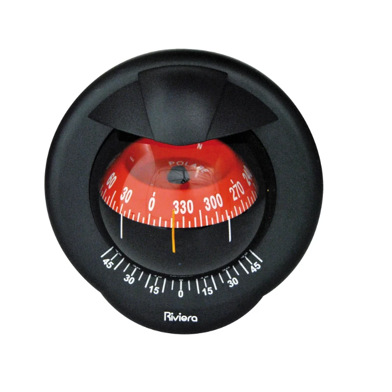 Le compas Polare RIVIERA & sa rose plate de ø 80 mm permet de suivre le cap à bord du bateau de plus de 25 noeuds. Sa graduation tous les 5° & le rappel du cap tous les 30° fait du compas RIVIERA, l’équipement de sécurité indispensable à bord du voilier ou du bateau moteur.