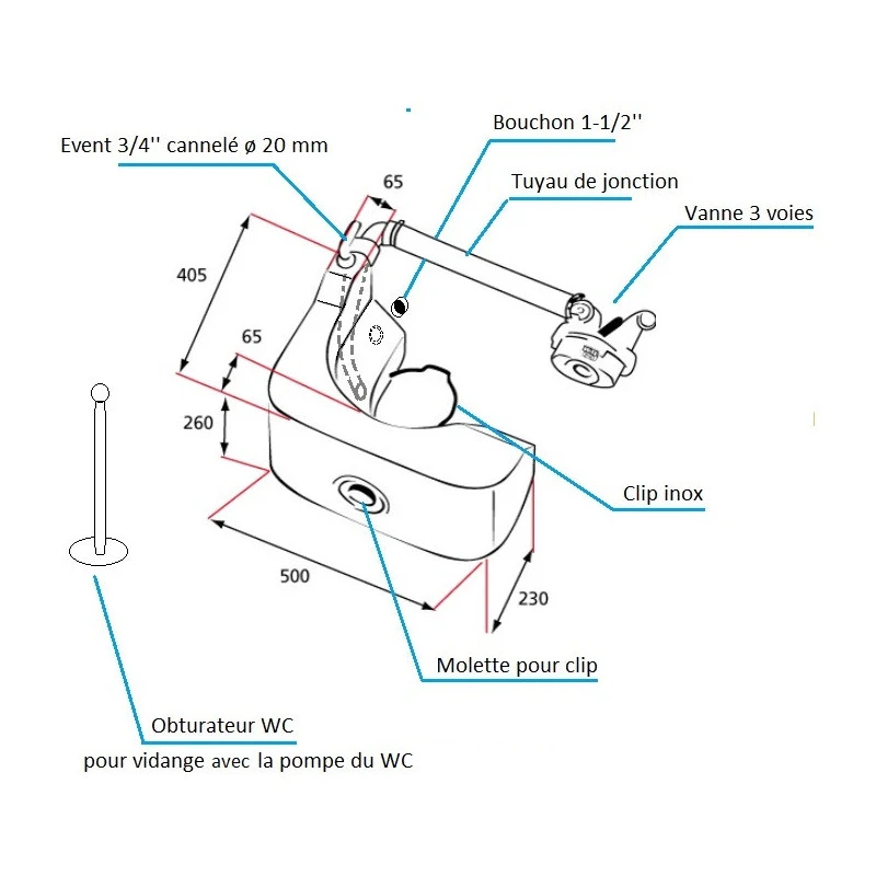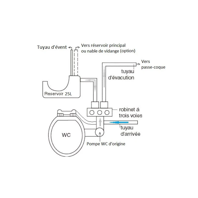 La mise en place de ce kit réservoir eau noir est très simple et à la portée de tous, elle permet de ne plus vidanger directement les eaux noires du bateau dans le port, le réservoir peux alors être simplement vidanger par la pompe manuelle des toilettes ou raccorder sur nable de vidange en passant par le pont du bateau :