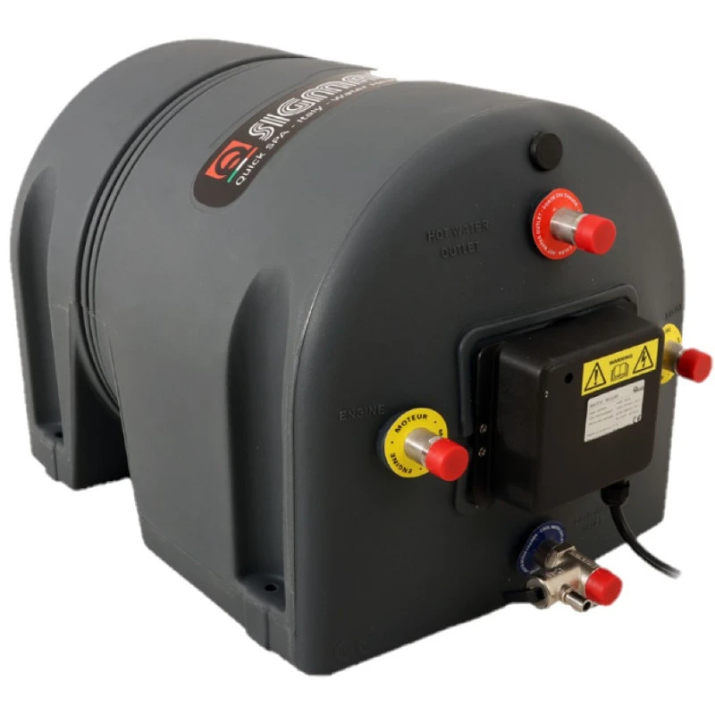 Ce chauffe-eau de bateau, fourgon et camping-car peut fonctionner, soit avec une résistance électrique 220 / 240 V, soit en récupérant les calories d’un liquide de refroidissement, comme celui d’un moteur, d’un chauffage ou d’un panneau solaire.