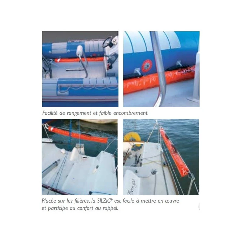 Outre l’argument de sécurité par rapport aux équipements traditionnels, la « SILZIG » est en plus grâce à sa forme facile à ranger en voilier le long d’une filière ou en semi-rigide entre le plancher et le boudin !