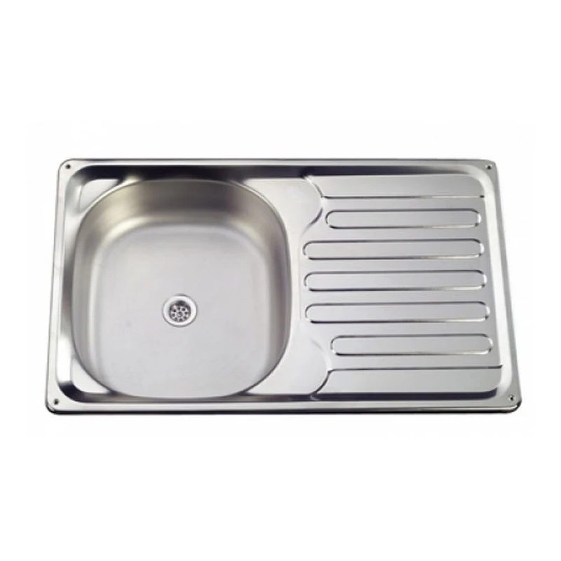 Grand évier en inox avec un égouttoir latéral, équipement parfait pour l’aménagement des camping-cars, fourgons aménagés ou bateaux.