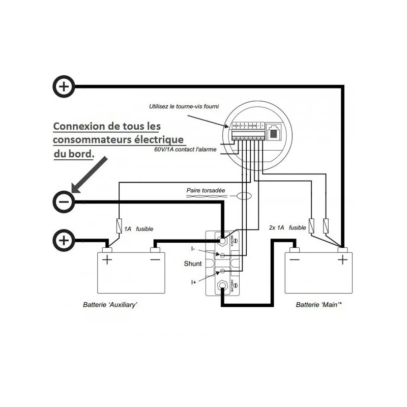 – Shunt de 500 ampères fourni (connecter tous les instruments Ă©lectrique du bord intensitĂ© max cumulĂ© 500 A)