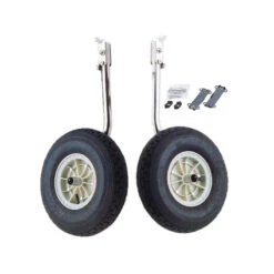 Paire de roue relevable pour bateau pneumatique type ZODIAC, compatible pour bateau charge lourde jusqu’à 180 kg, avec double système d’accroche tableau arrière, proposé en hauteur total 70 ou 80 cm.