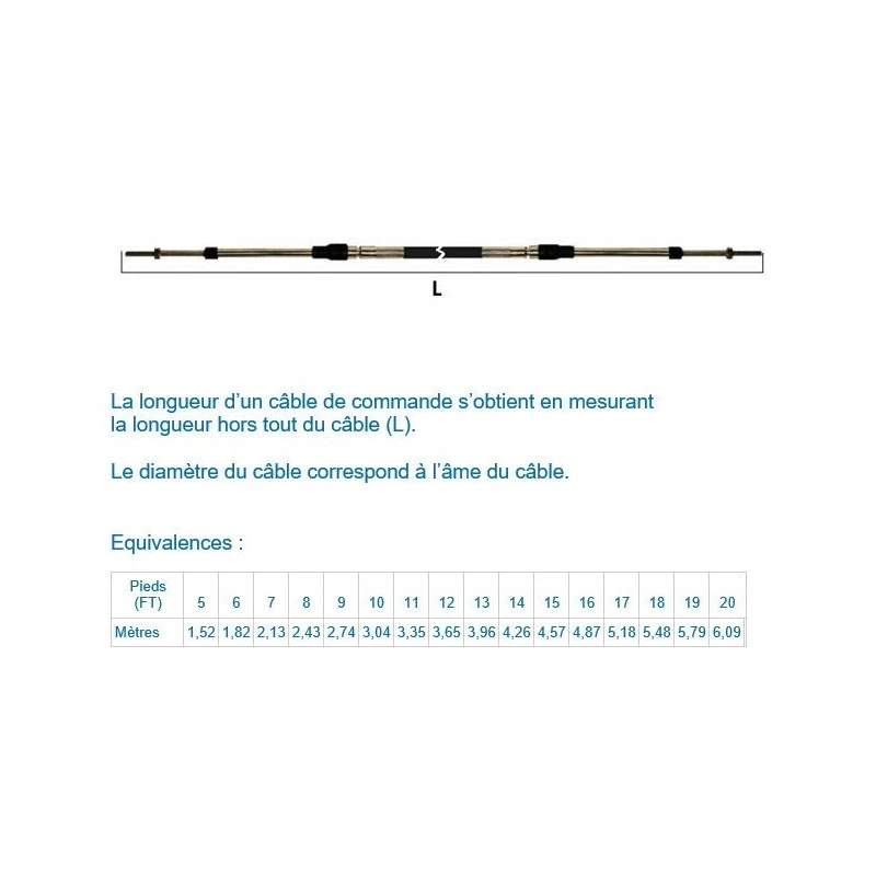 Câble de commande renforcé spécial pour grande longueur entre la manette de commande et le moteur, compatible commande marche avent / marche arrière ou régime moteur, toutes puissances du moteur in-bord et hors-bord toutes marques avec filetage 10-32UNF.