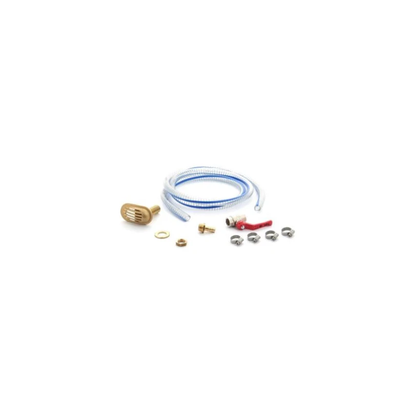 Le kit comprend : un tuyau d’eau potable de 2 mètres, une vanne quart de tour, quatre colliers de serrage, un passe coque type Ecope monobloc, un raccord cannelé.