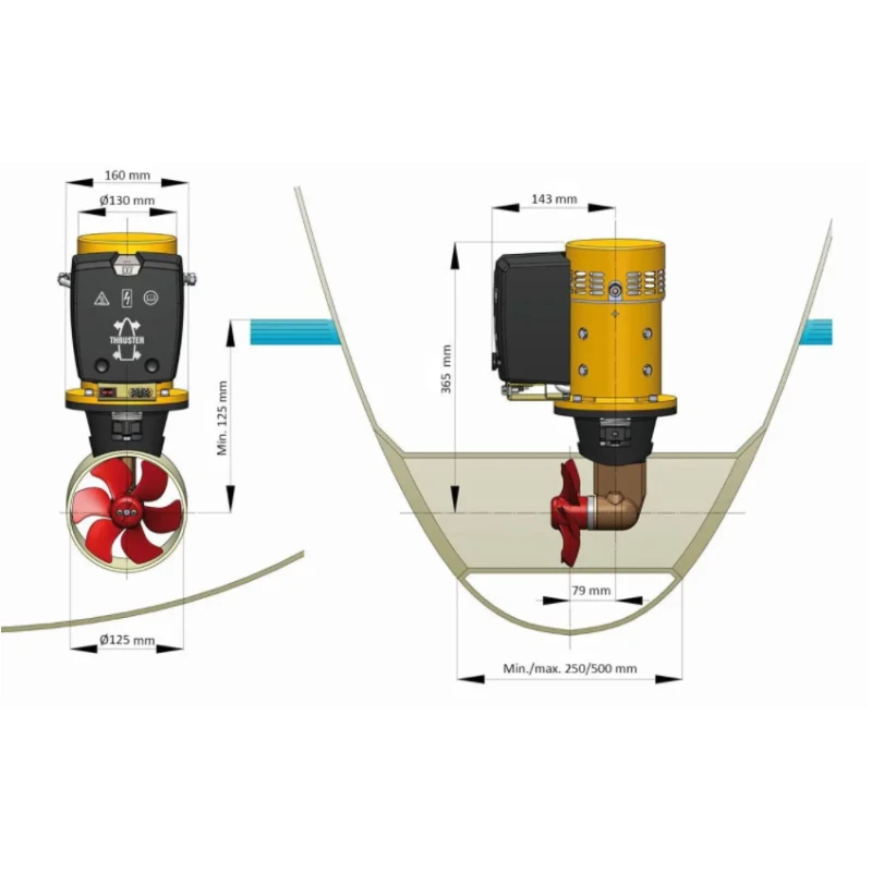 VETUS vous propose son kit complet prêt à installer. Il comporte le propulseur d’étrave, la tuyère en fibre de verre de Ø125 mm, le panneau de commande & son câble de raccordement de 6 mètres, un porte-fusible & un fusible de 250A.