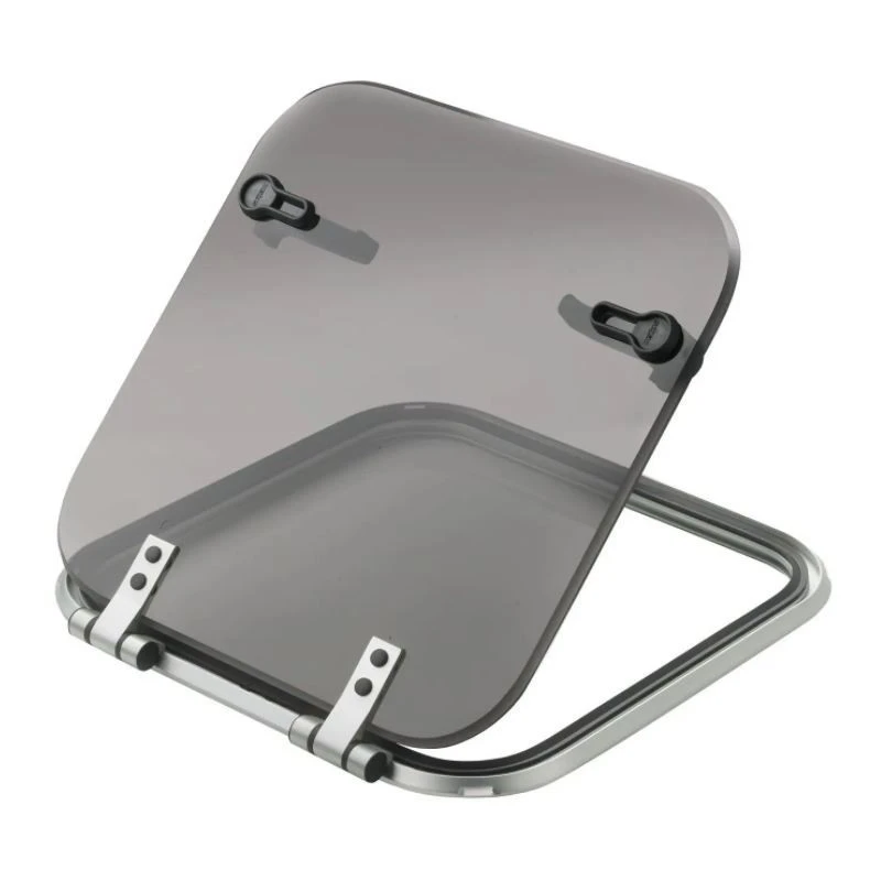 Ce panneau de pont peut être fermé en 2 positions : ouvert afin de laisser passer un filet d’air ou fermé & complètement étanche. L’ouvrant peut ensuite s’ouvrir & se régler de manière continu grâce au système de charnières.
